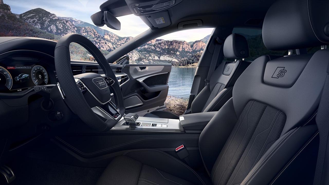 Dalla fiancata di Audi A7 Sportback TFSI e quattro emerge tutto il suo carattere sportivo. Il dinamismo del modello viene esaltato dalla linea della spalla inferiore, che orienta il focus visivo verso il basso, e dal finestrino posteriore, che culmina con un affinamento verso l’alto. Il pacchetto S line exterior include, di serie, i paraurti anteriori e posteriori con inserti a nido d’ape S line. Grazie alle sospensioni sportive, anch’esse di serie, Audi A7 Sportback TFSI e quattro è ribassata di 10 millimetri.