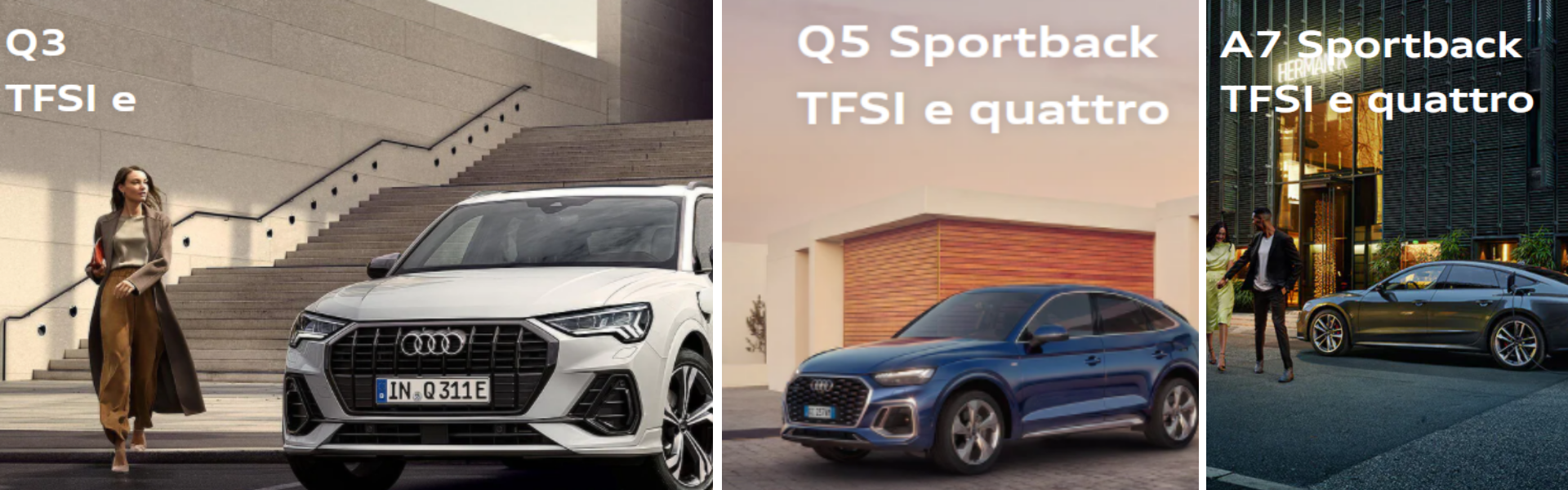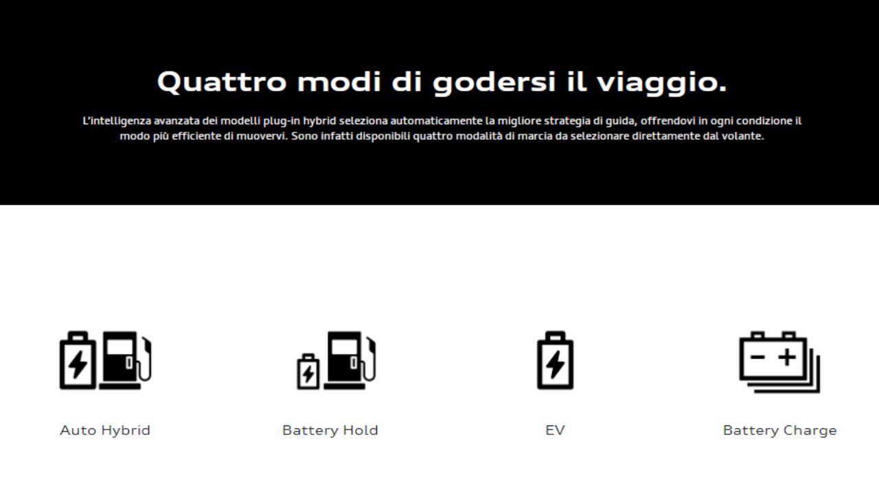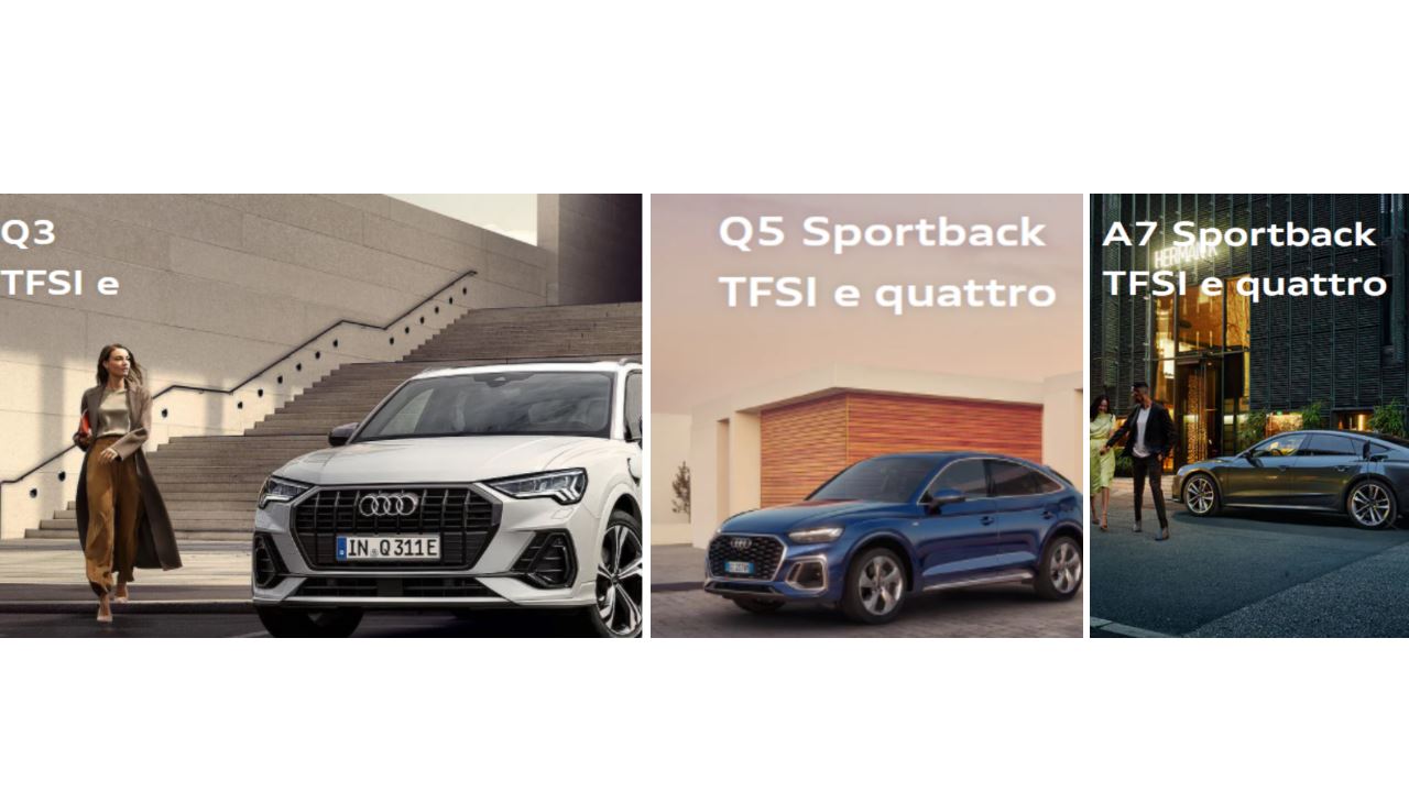 Audi vi presenta undici nuovi modelli che combinano il tradizionale motore a combustione all’innovazione di un propulsore completamente elettrico, per vivere i vostri percorsi quotidiani in modo totalmente sostenibile, grazie all’autonomia di oltre 40 km in modalità full electric.