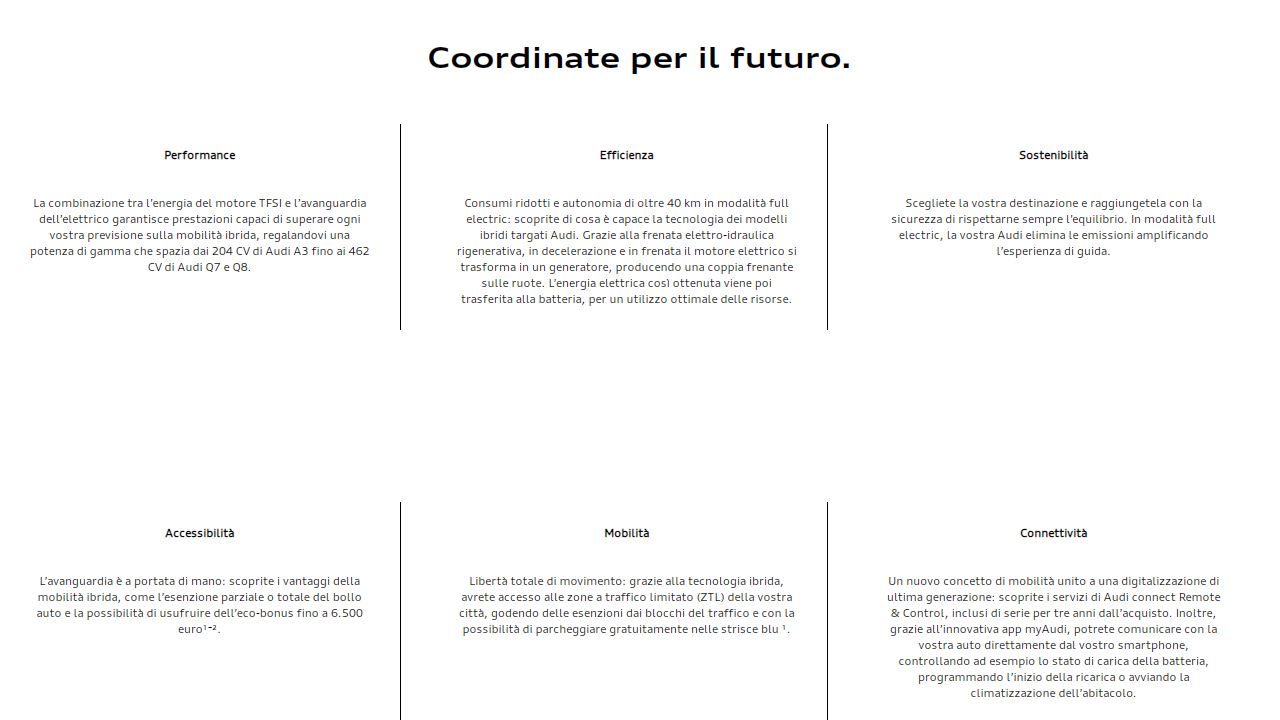 L’impegno di Audi verso il futuro si traduce in un obiettivo preciso: elettrificare progressivamente la propria gamma entro il 2025 sfruttando le tecnologie full electric, plug-in hybrid e mild-hybrid per viaggiare sicuri sulla strada della sostenibilità.