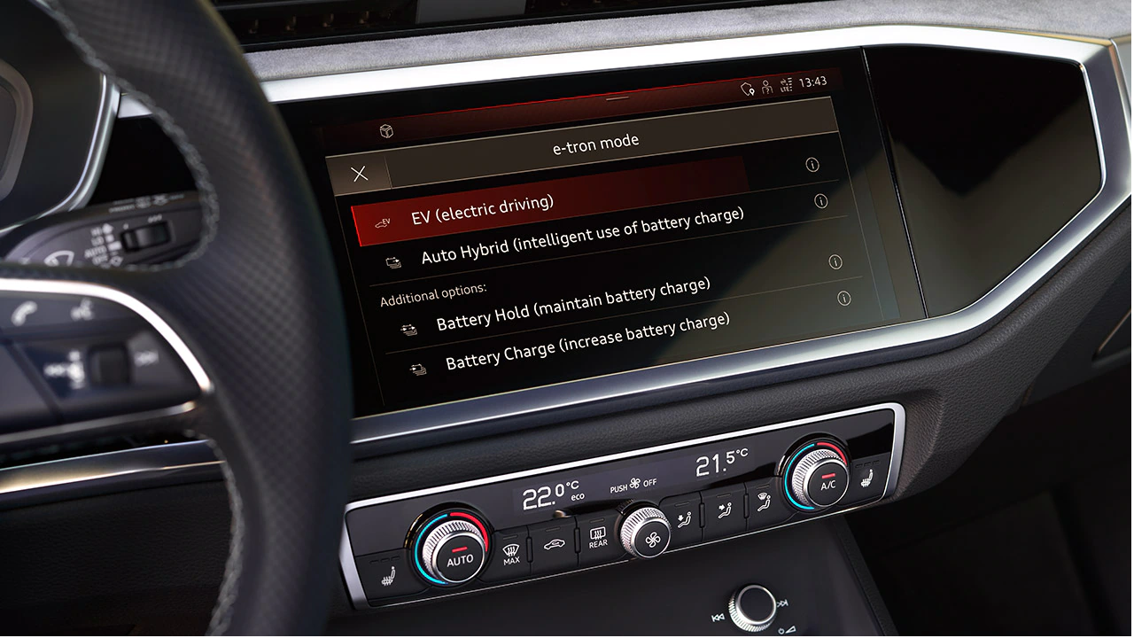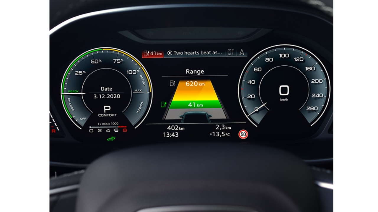 L’indicatore di potenza, posto all’interno dell’Audi virtual cockpit, mostra il flusso di energia complessiva del sistema, la modalità di guida prescelta e lo stato di carica della batteria. Al centro, come nell’app myAudi, è invece visibile l’autonomia residua di Audi Q3 Sportback TFSI e.