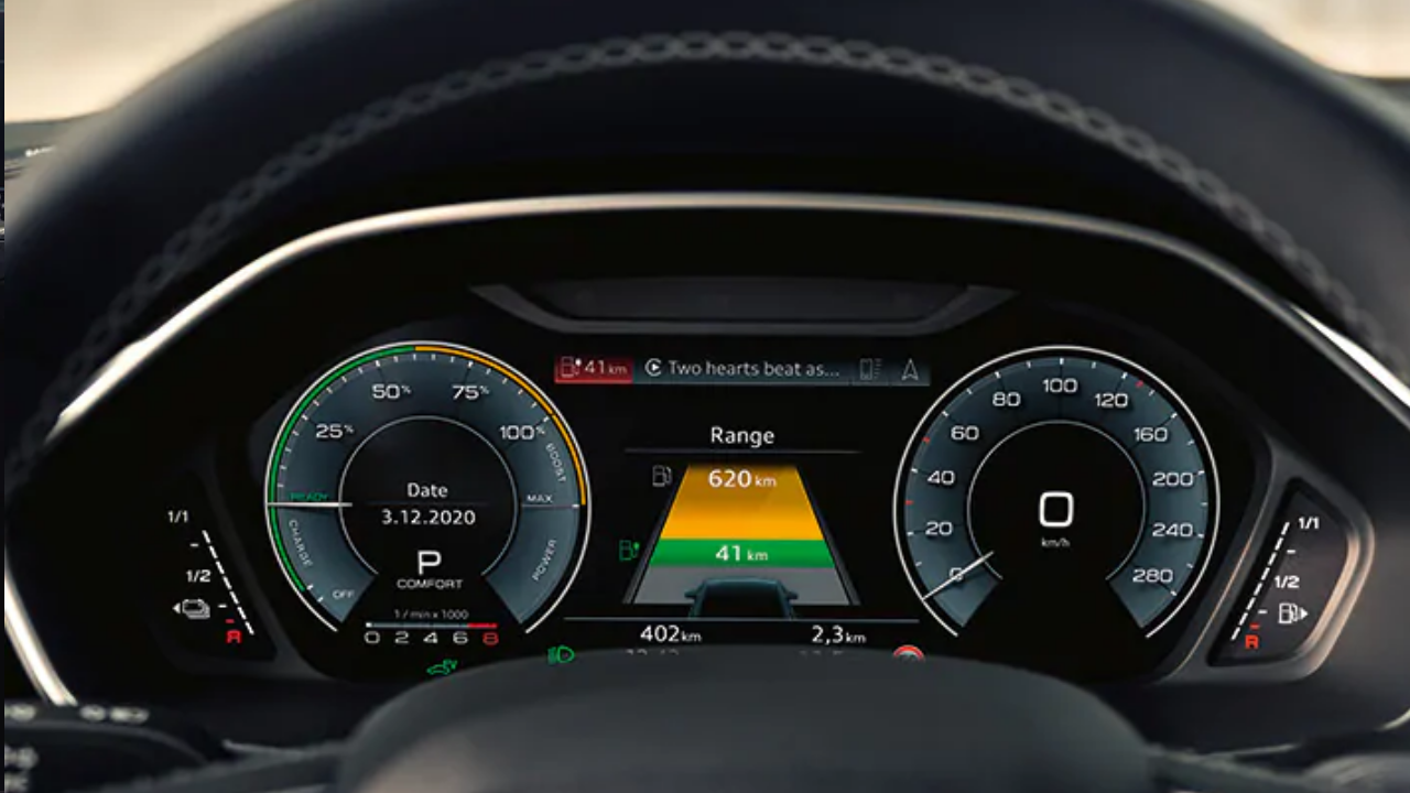 Oltre alle numerose funzionalità e schermate abituali, il display MMI ad alta risoluzione e l’Audi virtual cockpit forniscono un resoconto costante dell’autonomia residua del veicolo e del suo flusso di energia. Inoltre, l’indicatore di potenza all’interno dell’Audi virtual cockpit vi permette di acquisire a colpo d’occhio tutte le informazioni sulle prestazioni elettriche, sullo stato di carica della batteria e sul recupero di energia in frenata.