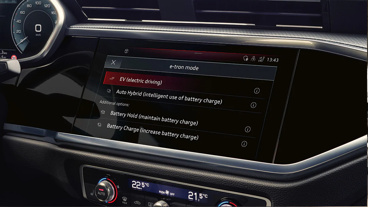 Quando la batteria è carica, Audi Q3 TFSI e parte sempre in modalità EV (esclusivamente elettrica), avviando il motore a combustione solo quando è necessario. La vettura passa alla modalità ibrida quando si inserisce una destinazione nel sistema di navigazione. Grazie all’utilizzo di un’estesa quantità di dati relativi al percorso da compiere, la vostra Audi Q3 TFSI e gestisce l’interazione fra le due unità, per consentirvi di completare il maggior numero di viaggi possibili in modalità completamente elettrica. Inoltre, il sistema MMI presenta ulteriori possibilità di guida: oltre a quella EV del tutto elettrica, per compiere brevi spostamenti quotidiani, sono presenti le modalità Battery Hold e Battery Charge⁴, rispettivamente per conservare costante o aumentare il livello di carica della batteria, per una successiva guida in elettrico.