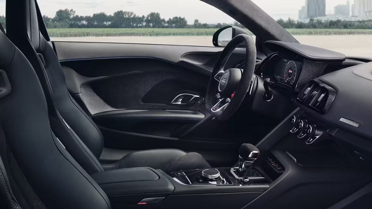 Un arco ampio e sagomato racchiude tutti i comandi, ricordando lo stile di design orientato verso il conducente, tipico delle monoposto da competizione. I sedili sportivi a guscio specifici di R8 Coupé V10 performance quattro, rivestiti in pregiata pelle Nappa, disponibili su richiesta con il pacchetto design Audi R8 Performance, offrono un maggiore supporto laterale.