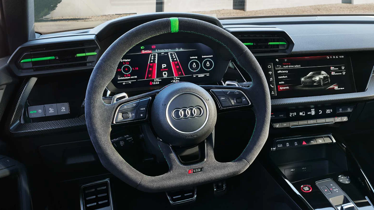 Il volante sportivo in pelle a 3 razze multifunzione plus, di serie, appiattito nella parte inferiore e dotato di leve del cambio RS integrate e pulsante RS, permette di avere sempre sotto controllo le straordinarie performance di Audi RS 3 Sedan. Il volante è disponibile, su richiesta, anche con rivestimento in Alcantara e tacca a ore 12.