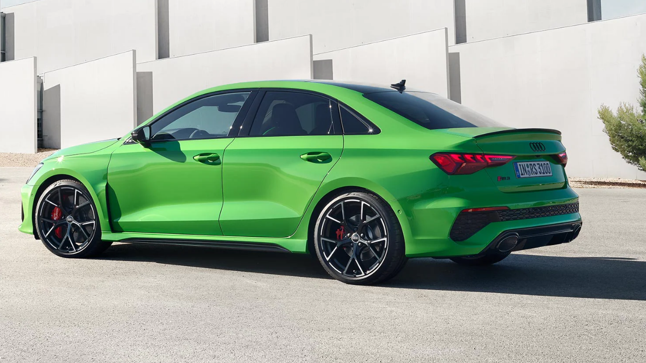 L'indiscussa indole sportiva di Audi RS 3 Sedan emerge chiaramente nella parte posteriore della vettura, grazie al paraurti specifico RS con inserto diffusore esclusivo RS 3, accentuando in nero lucido, e dal sistema di scarico sportivo RS, disponibile su richiesta, con terminali di scarico in nero lucido