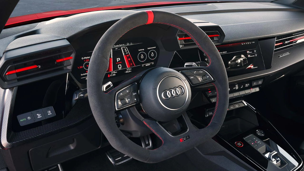 straordinarie performance di Audi RS 3 Sportback. Il volante è disponibile, su richiesta, anche con rivestimento in Alcantara” e tacca a ore 12.