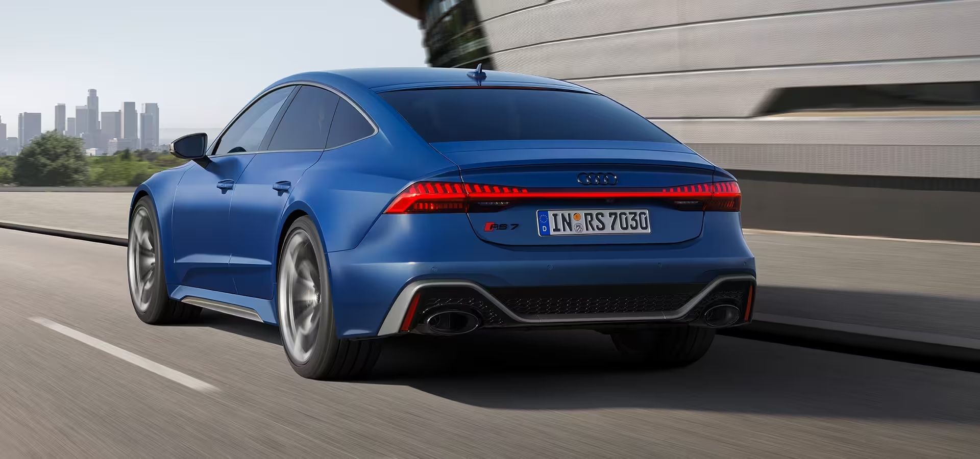 Esclusivi dettagli di stile, come la vernice Audi exclusive Blu Ascari effetto opaco, disponibile su richiesta e gli elementi esterni in Grigio opaco riflettono le prestazioni sorprendenti di Audi RS 7 Sportback performance.