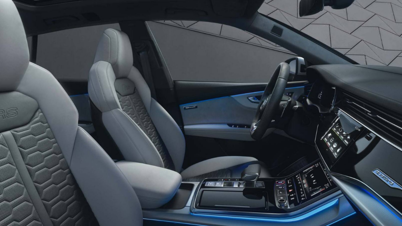 L’abitacolo di Audi RS Q8 si contraddistingue per gli elementi specifici RS. Inoltre, il pacchetto design RS Rosso, disponibile su richiesta, aggiunge dettagli esclusivi allo stile interno della vettura.