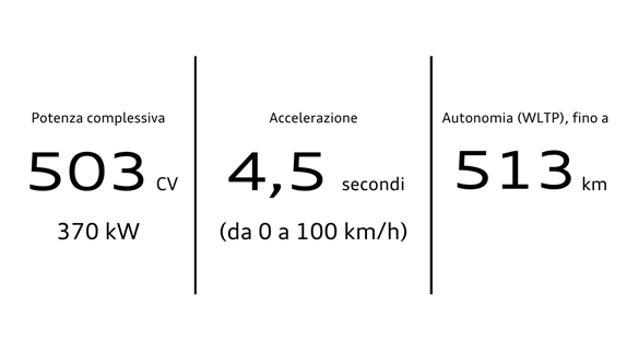 La ricarica veloce è oggi possibile, fino a un massimo di 170 kW, nelle stazioni di ricarica ad alta potenza. Grazie alla funzione pianificatore di percorso e-tron, le fermate per la ricarica sono già integrate nel tragitto fino a destinazione, in modo da sfruttare al meglio l’elevata capacità di ricarica.