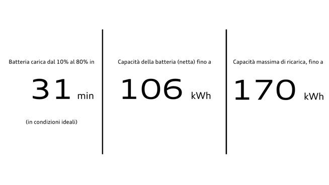 La ricarica veloce è oggi possibile, fino a un massimo di 170 kW, nelle stazioni di ricarica ad alta potenza. Grazie alla funzione pianificatore di percorso e-tron, le fermate per la ricarica sono già integrate nel tragitto fino a destinazione, in modo da sfruttare al meglio l’elevata capacità di ricarica.