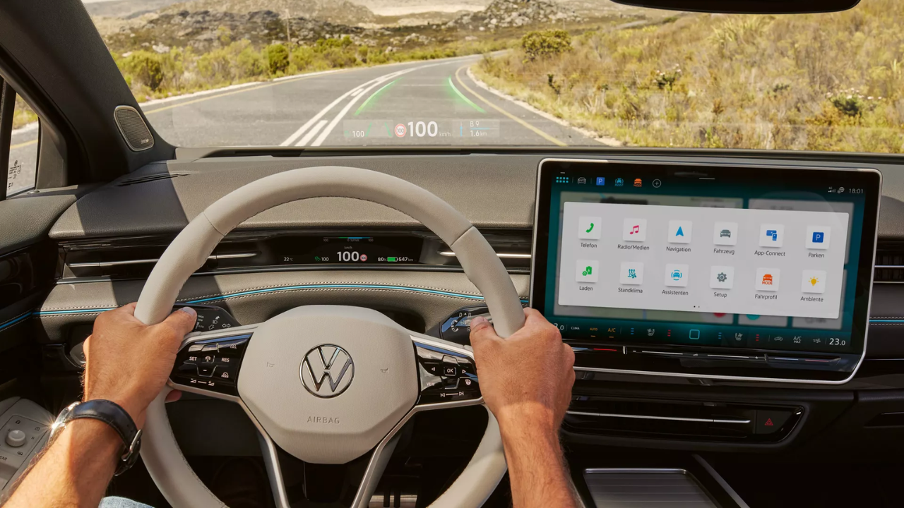 L'alta tecnologia si sovrappone alla realtà a bordo della tua ID. e ti consente di tenere sotto controllo tutto ciò che è più importante: l'Head-up display con realtà aumentata proietta importanti informazioni digitali direttamente sul parabrezza della vettura, all’interno del tuo campo visivo. Ad esempio, puoi scegliere di visualizzare le informazioni di navigazione come i cambi di corsia o le frecce che indicano la tua direzione proprio sulla strada che stai percorrendo, senza distogliere lo sguardo dalla guida. Così raggiungerai la tua destinazione ancora più rilassato.